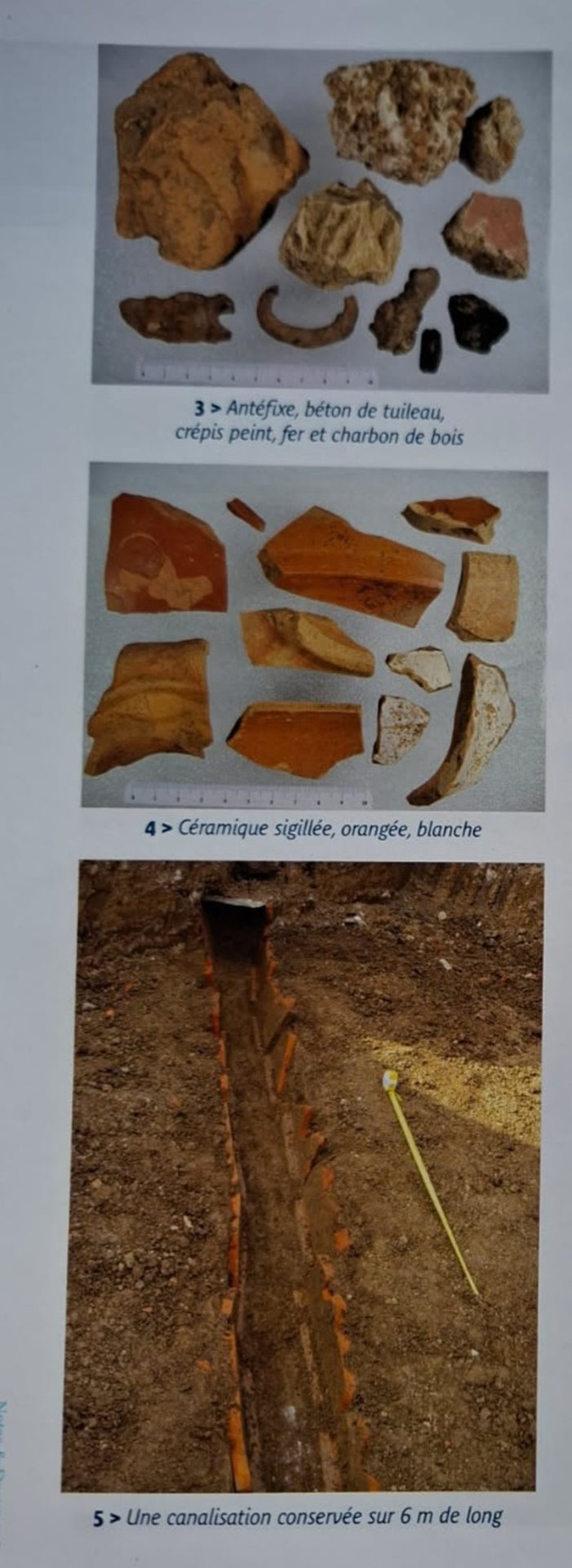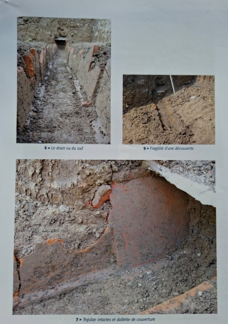 Cet ouvrage, retrouvé à environ 1,5 m sous le niveau du sol, était composé d’une double rangée de Tegulaé recouverte d’une dalle calcaire. Sa taille importante et le fait que le fond soit composé de terre naturelle laisse penser qu’il s’agissait d’un égout qui desservait au moins une dizaine de maisons.