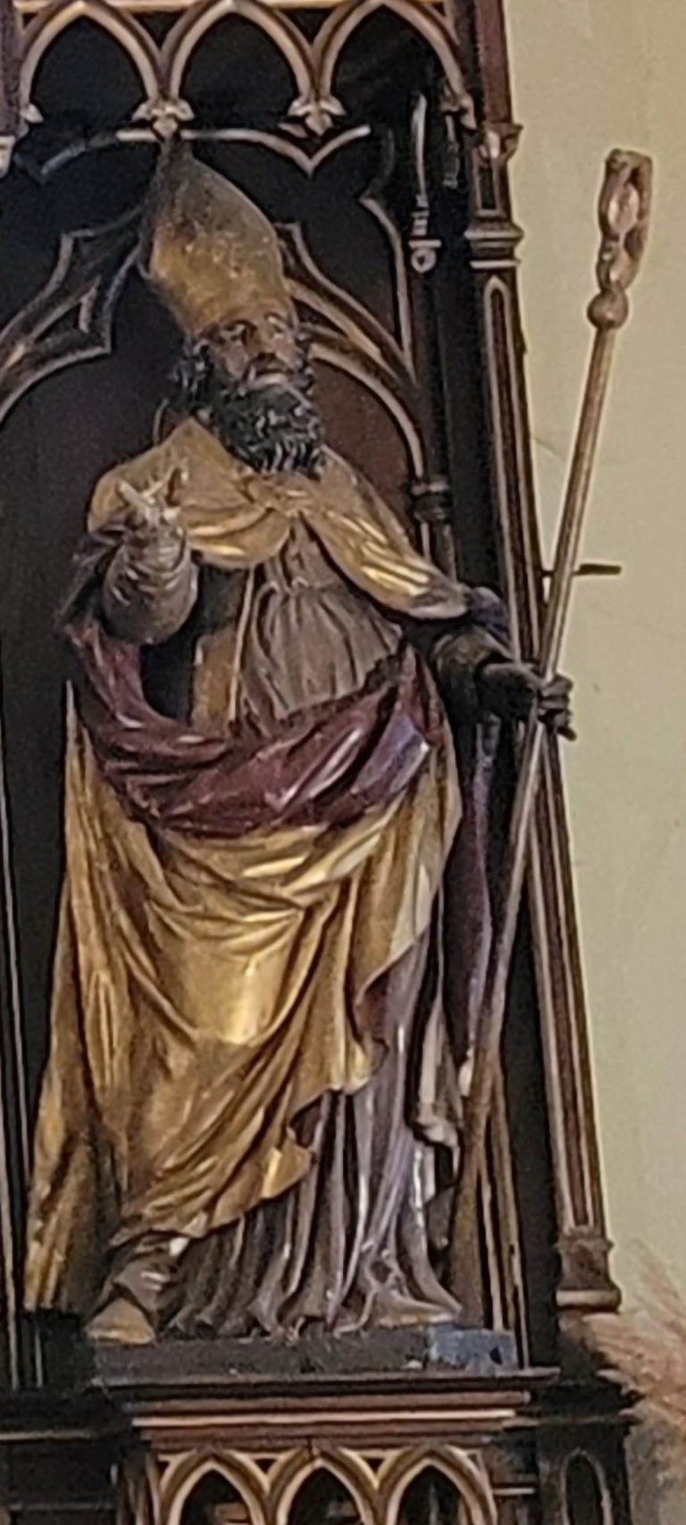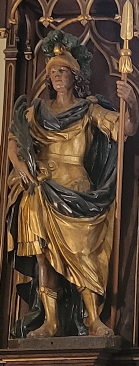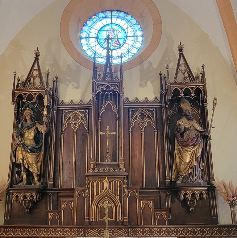 – Derrière le retable du Maître Autel actuel, une peinture à l’effigie de St Germain et de St Hippolyte, toutes deux surmontées de figures d’anges.