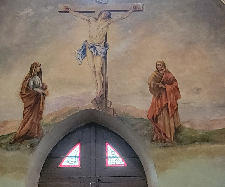 -Cette ancienne convention indiquait également la présence sur le mur du fond de l’église, au-dessus de la porte, d’une peinture monumentale de Jésus-Christ avec la Vierge Marie, Saint Jean l’évangéliste et Marie-Madeleine. Il est là aussi très probable que cette œuvre de 1612 ait été recouverte ou modifiée en 1934 par une nouvelle fresque monumentale ou les mêmes personnages sont représentés mais ce coup-ci sans Marie-Madeleine….cette peinture est signée d’un «H. Comas 1934»..