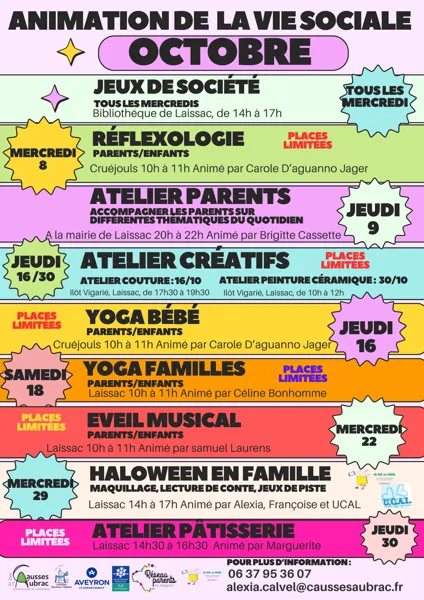Venez fêter halloween en famille à Laissac de 14h à 17h . Au programme : Maquillage, lecture de conte, jeux de piste. Inscription obligatoire : 06 37 95 36 07 ou alexia.clavel@caussesaubrac.fr