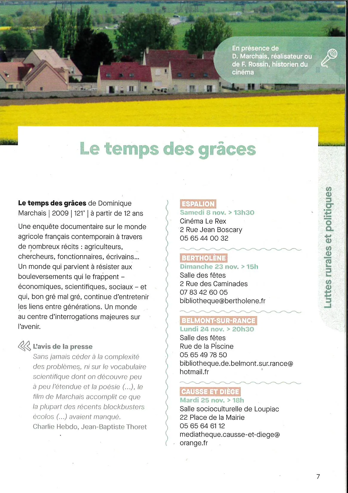 Dans le cadre du mois du film documentaire en Aveyron sur le thème »Terre Nourricière », la bibliothèque à la salle des fêtes de Bertholène vous propose la projection du film « Le temps des grâces » en présence du réalisateur du film,Dominique MARCHAIS.