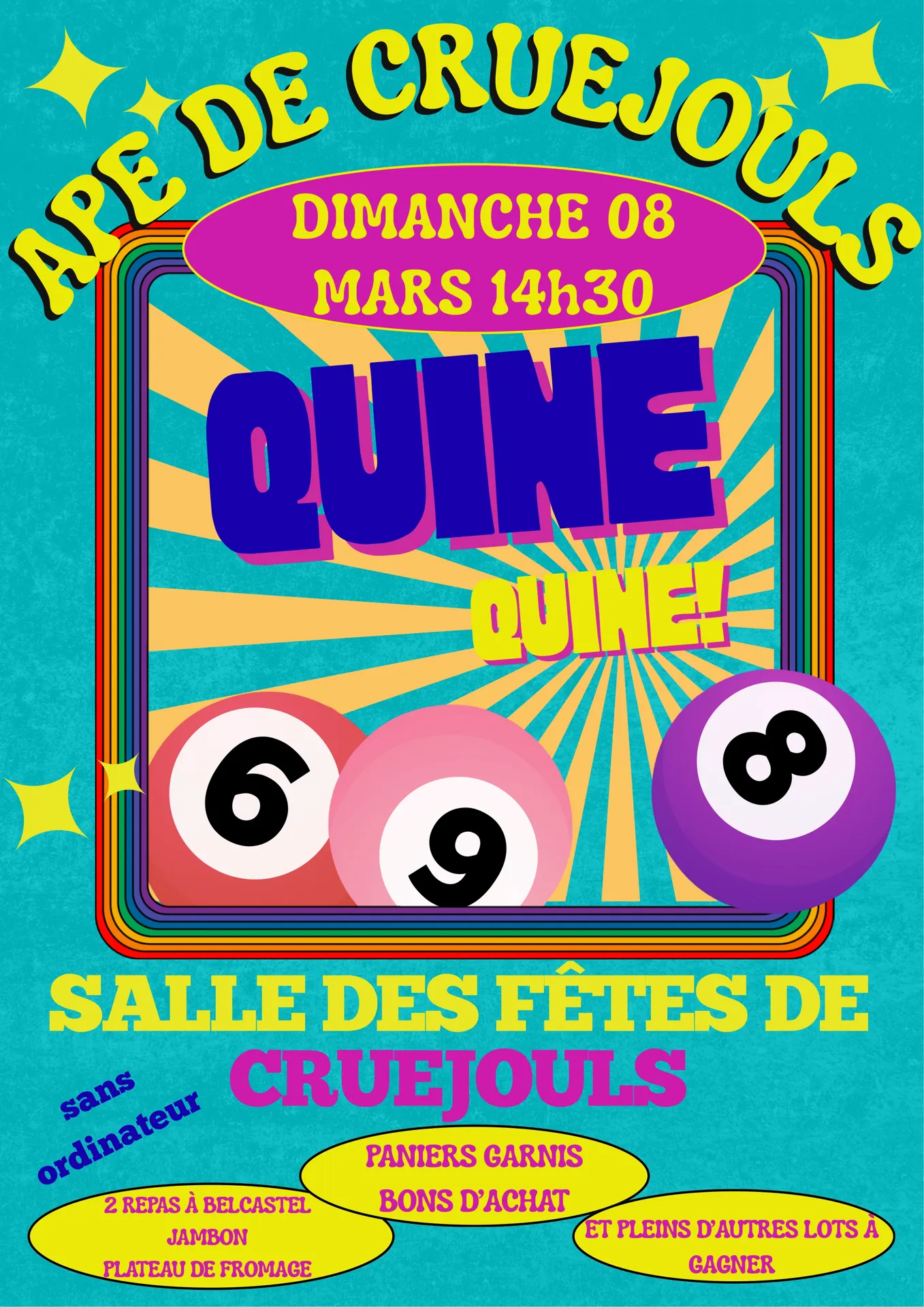L’APE de Cruéjouls organise un quine à 14h30 à la salle des fêtes de Cruéjouls.