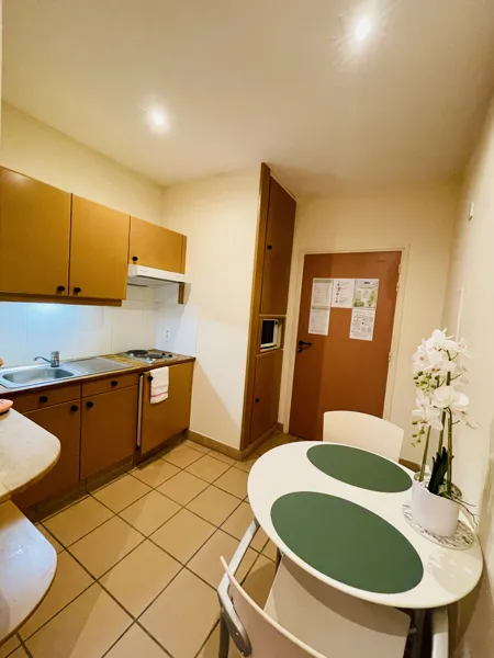 Appartement tout équipé, avec un coin cuisine/repas, un coin chambre (2 lits simples) avec un espace de travail et une salle de bain privative avec baignoire.