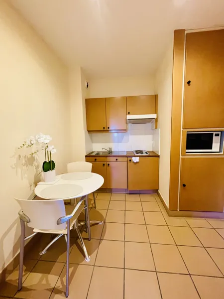 Appartement tout équipé, avec un coin cuisine/repas, un coin chambre (1 lit double) avec un espace de travail et une salle de bain privative avec baignoire.