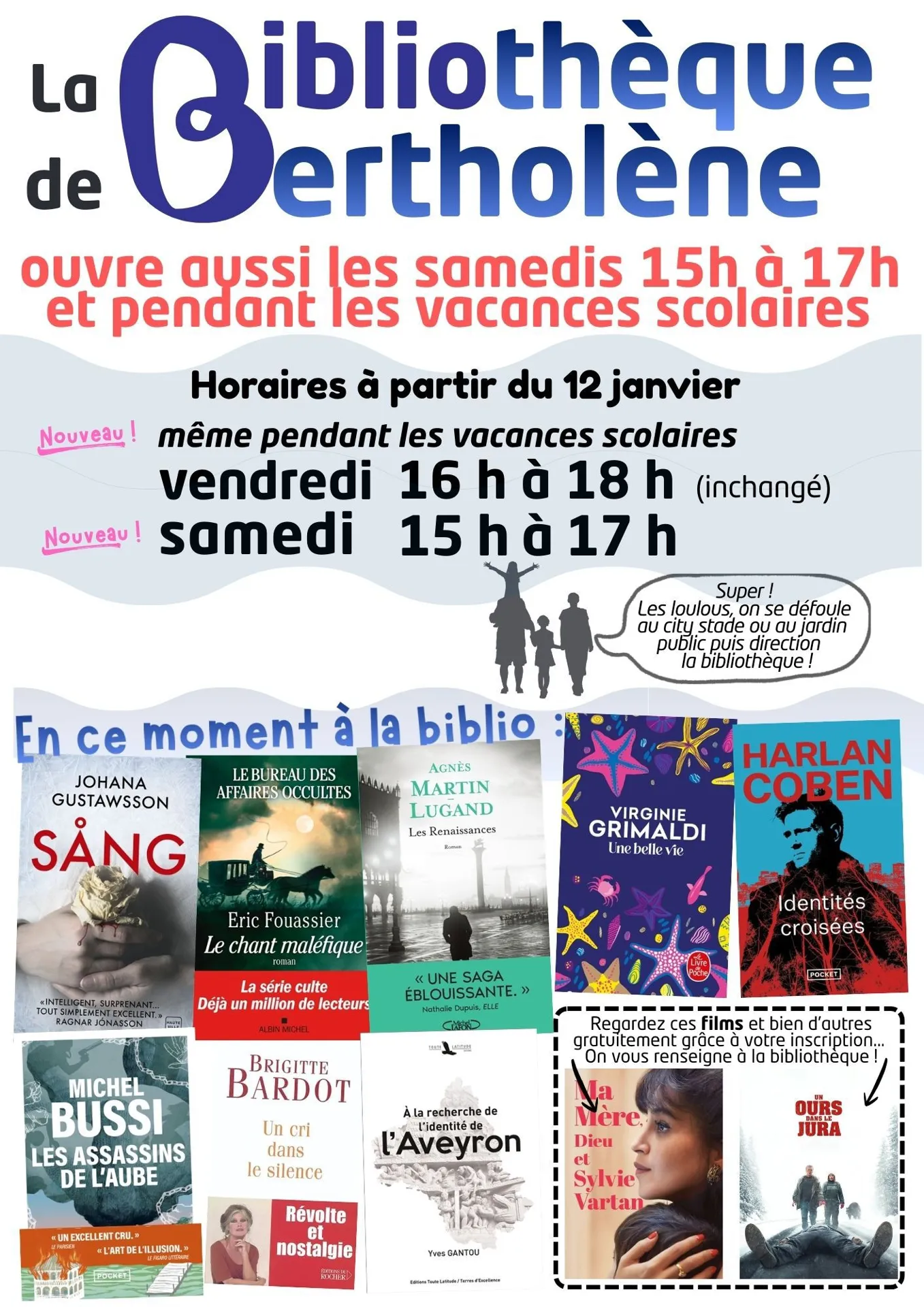 La bibliothèque de Bertholène ouvre les vendredis de 16h à 18h et les samedis de 15h à 17h. Elle est également ouverte pendants les vacances scolaires. Voici l’adresse : 166 rue de l’Aveyron 12310 Bertholène